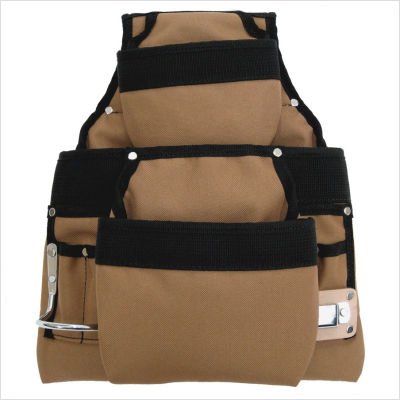 76927 Features: -Nail and tool pouch.-Material: Heavy duty 600D polyester.-9 Pockets.-Stitching with heavy duty nylon thread.-Contrast polyester reinforced pouch binding.-Metal hammer holder.-Metal tape clip.-Rivets with caps for safety. Color/Finish: -Color: Khaki, black.-Finish: Antique. Dimensions: -Fits belt size up to 3'' wide.-Dimensions: 12'' H x 10'' W x 3'' D.